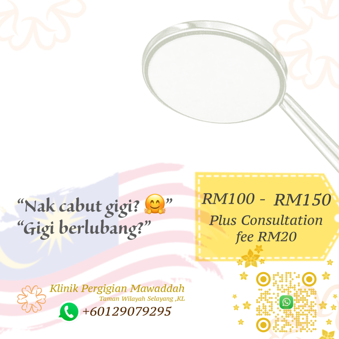 Sapuan flourida, tampalan gigi, cucian gigi, rawatan akar gigi. Harga dari RM50-RM250.